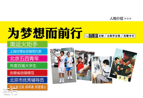 人,最宝贵的是生命,生命对于每个人来说只有一次,我却活过两回,当我回首往事时,不因无法鼓掌而苦恼,也不因失去双手而悔恨,因为,只要生命不息,就可以坚持到底。 ——王恒 王恒,资深设计师、广告人、青年画家,1983年出生于安徽省的一个小农村,四岁触电失去双手,幼好绘事,舞枪弄棒。 2015年,受邀参加纪念抗日战争及世界反法西斯战争胜利70周年阅兵观礼;2013年,荣获北京五四青年奖章;2011年,获得安徽省“自强模范”称号;2010年受邀上海世博会,向五大洲朋友现场展示中国书画艺术,多幅作品被世博馆收藏;2009年毕业于中国传媒大学广告系艺术设计专业,入选中国大学生年度百强人物;2008年,被奥组委选拔为北京奥运会火炬手。早年师从王建中、黄仲基和方衡教授,2009年正式拜著名书法家杨再春先生为师,2010年拜著名书画家阿里雷公先生为师,2014年投师大写意大师张立辰先生门下。 学习书画的同时,也酷爱体育运动,喜欢跆拳道和足球,在省级国家级残运会田径项目上,共获得数十枚金牌,荣获国家优秀运动员称号。获的全国力奥杯跆拳道邀请赛健全人65kg级亚军。 受邀录制央视《向幸福出发》、《中国梦想秀》、《鲁豫有约》、安徽卫视、四川卫视、优酷、腾讯等众多节目。在全国高校及企业进行巡回演讲,宣讲“中国梦,我的梦”个人励志故事,被授予中国当代励志人物、优秀辅导员等称号。 皇马主帅穆里尼奥、世界足球先生卡卡和巨星菲戈称赞并亲赠签名球衣。